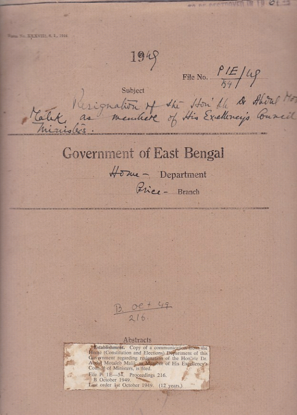 Resignation of the Hon'ble Dr. Abdul Motaleb Malik as member of His Excellency's council of ministers.