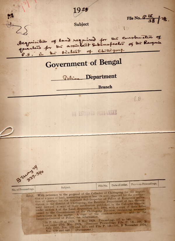 | Rack No. 21, Bundle No. 04, Sl No. 331 Reconstruction of the Barisal Reserve Police Lines. | Rack No. 21, Bundle No. 04, Sl No. 332 Payment to the Eastern Bengal Railway for inspection rooms at Bonapara & 4 others Railway P.S. | Rack No. 21, Bundle No. 04, Sl No. 333 Construction of Noakhali Police Lines at Maijdi. | Rack No. 21, Bundle No. 04, Sl No. 334 Acquisition of land required for the Rangunia P.S. in Chittagong District. | Rack No. 21, Bundle No. 04, Sl No. 335 Erection of permanent buildings at Sonapur in Noakhali District. | Rack No. 21, Bundle No. 04, Sl No. 336 Extension of Bengal Public Gambling Act, 1867 to certain mouzas in the sadar subdivision of Rajshahi. | Rack No. 21, Bundle No. 04, Sl No. 337 Extension of Bengal Public Gambling Act, 1867. |