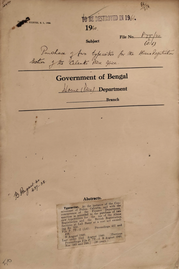 Purchase of two Typewriters for the Aliens Registration Section of Calcutta Police office.