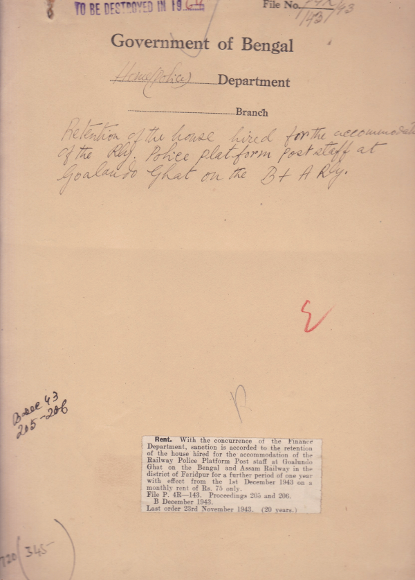 Retention of the house hired for the accommodation of the Railway Police Platform Post Staff at Goalundo Ghat, Faridpur.