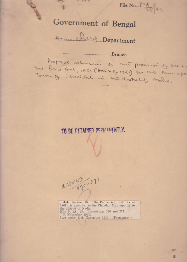 | Rack no. 22, Bundle No. 59, Sl No. 3713 Investigation of the arrear claim of Babu Sarat Chandra Cuha a Clerk of Bakerganj Police Office. | Rack no. 22, Bundle No. 59, Sl No. 3714 Special Police Establishment Ordinance. | Rack no. 22, Bundle No. 59, Sl No. 3715 Provision of brick flat pathway in the compound of the residence of the Deputy I.G. Bakarganj Range, Barisal. | Rack no. 22, Bundle No. 59, Sl No. 3716 Extension of the Provision of Section 34 of the Police Act, 1861. | Rack no. 22, Bundle No. 59, Sl No. 3717 Protection of the telephone room in the Double Moorings P.S in Chittagong. | Rack no. 22, Bundle No. 59, Sl No. 3718 Counting of military service of constable Badruddin of Chittagong district Police. | Rack no. 22, Bundle No. 59, Sl No. 3719 Entertainment of an additional clerk in the Gazette Section of the C.I.D. |