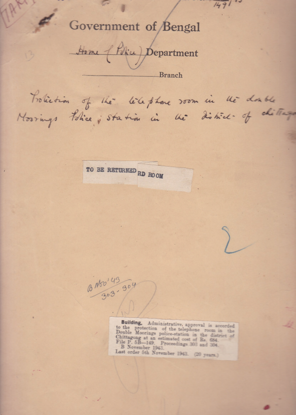 | Rack no. 22, Bundle No. 59, Sl No. 3714 Special Police Establishment Ordinance. | Rack no. 22, Bundle No. 59, Sl No. 3715 Provision of brick flat pathway in the compound of the residence of the Deputy I.G. Bakarganj Range, Barisal. | Rack no. 22, Bundle No. 59, Sl No. 3716 Extension of the Provision of Section 34 of the Police Act, 1861. | Rack no. 22, Bundle No. 59, Sl No. 3717 Protection of the telephone room in the Double Moorings P.S in Chittagong. | Rack no. 22, Bundle No. 59, Sl No. 3718 Counting of military service of constable Badruddin of Chittagong district Police. | Rack no. 22, Bundle No. 59, Sl No. 3719 Entertainment of an additional clerk in the Gazette Section of the C.I.D. | Rack no. 22, Bundle No. 59, Sl No. 3720 Installation of a second telephone connection in the Police Directorate of Comilla. |