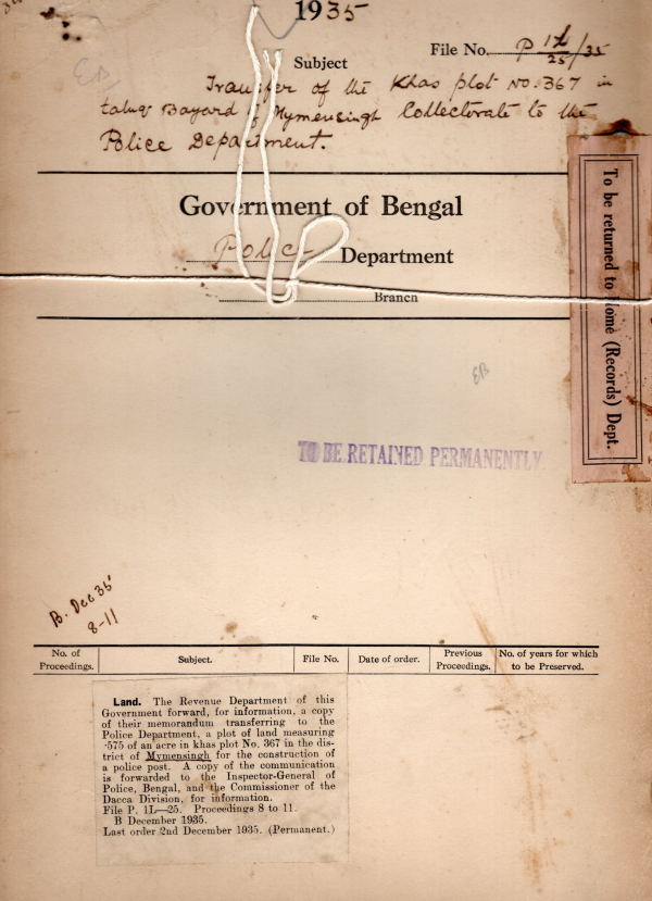 Transfer of the Khas Plot no 367 in Bayard, of Mymensingh Collection ate to the Police Department.