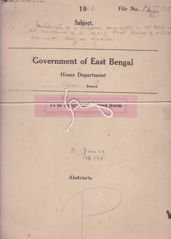 | Rack no. 23, Bundle No. 77, Sl No. 6062 Absorption of Certain Police Personnel of the Control Indian Agency who opted for Pakistan. | Rack no. 23, Bundle No. 77, Sl No. 6064 Amalgamation of the Railway Protection Police with the Railway Police as (Armed) Sanction of Passing the Salary bills. | Rack no. 23, Bundle No. 77, Sl No. 6065 Re-allotment of fund Credited to treasury through mistake. | Rack no. 23, Bundle No. 77, Sl No. 6066 Installation of telephone Connection in the office and the residence of the Deputy Inspector general of Police on Special duty at Dacca. | Rack no. 23, Bundle No. 77, Sl No. 6067 Arrest of Atiar Rahman a constable of Pakistan Police at Dacca (formerly a constable of Special Branch Calcutta Police). | Rack no. 23, Bundle No. 77, Sl No. 6068 Application from Mvi. Shain uddin Ahmed for a post in Dy. High Commissioners office in Calcutta. | Rack no. 23, Bundle No. 77, Sl No. 6069 Present whereabouts of witnesses in G.R. Case No. 124/47. |