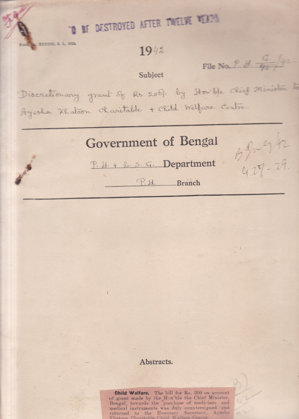 Discretionary grant of Rs. 200/- by Honorable Chief Minister to Ayesha Khatoon Charitable + Child welfare Centre.