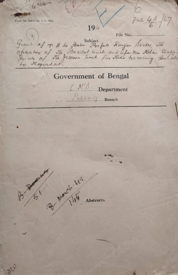 Grant of T.A. to Babu Profull Ranjan Sarker the operator of the Barisal Unit and Upe Mohan Shaha driver of the Jessore units for their travelling from Calcutta to Mograhat.
