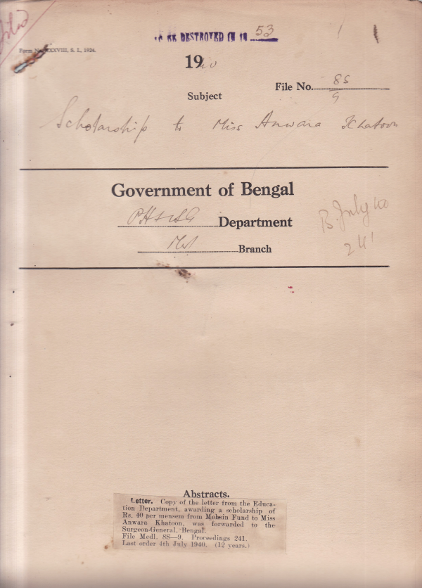 Scholarship to Miss Anwara bhatooon from Mohsin fund.