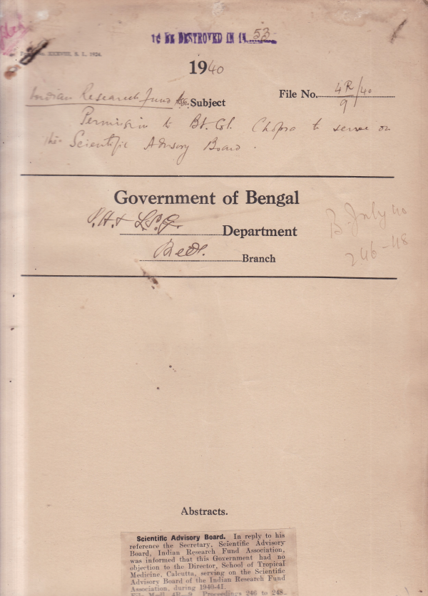 | Rack no. 08, Bundle no. 72, Sl no. 5501 Scholarship to Miss Anwara bhatooon from Mohsin fund. | Rack no. 08, Bundle no. 72, Sl no. 5502 Detention of Mr. Hagarli for the treatment as paying patients. | Rack no. 08, Bundle no. 72, Sl no. 5503 Extension of tenure of appointment of Dr. Jagesh Chandra Mukherjee, Assistant Prof. of pathology, Medical College, Calcutta. | Rack no. 08, Bundle no. 72, Sl no. 5504 Scientific Advisory Board I.R.F.A. | Rack no. 08, Bundle no. 72, Sl no. 5505 Acceptance of fee by Casually officers Campbell Hospital from Calcutta Corporation. | Rack no. 08, Bundle no. 72, Sl no. 5506 Classification of voted and charged expenditure under the G/I Act, 1935. | Rack no. 08, Bundle no. 72, Sl no. 5507 Extension of tenure of appointment of Dr. P. Sanyal and K.K. Ghosh. |