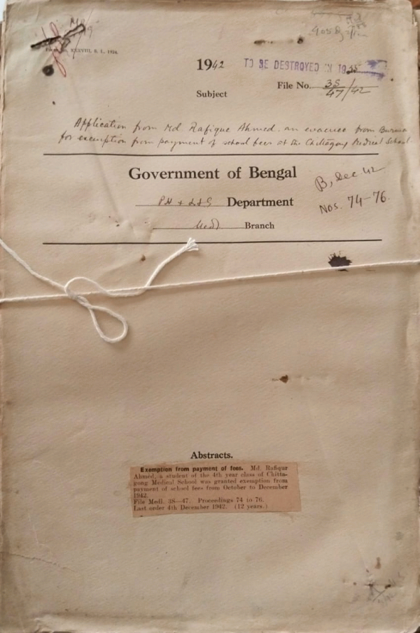 Application from Md. Rafiqul Ahmed an evacuee from payment of school fees at the Chittagong Medical School.