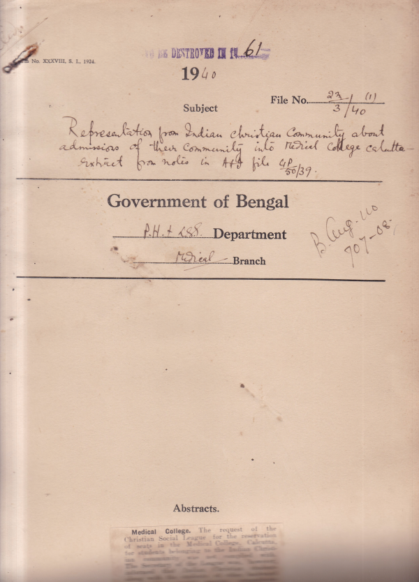 Representation from Indian Christian Community about admissions of their community into Medical College Calcutta extract from notes in A & I file.