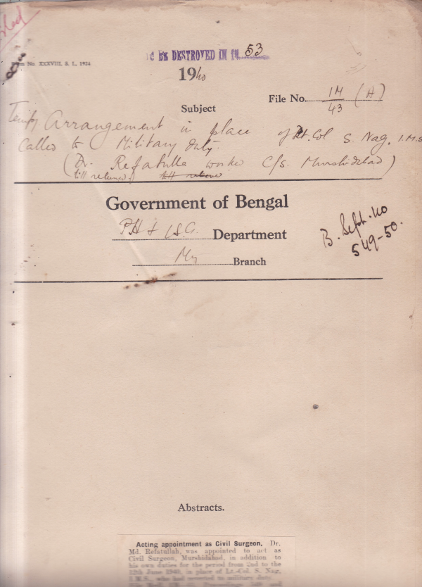 Temporary arrangement in place of Lt. Col. S. Nag, I.M.S. Called of Military duty.