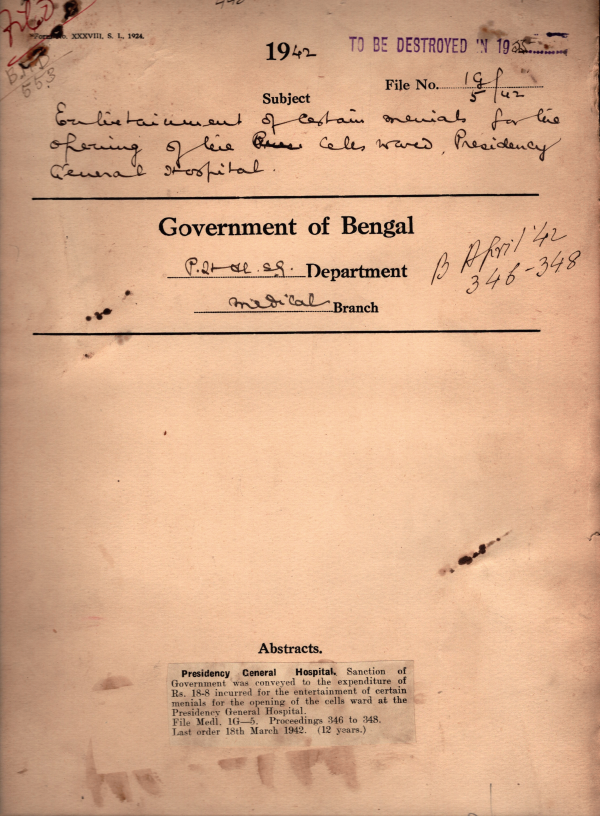 | Rack No. 09; Bundle No. 86 SL No. 6615 Grant to the Calcutta Hospital Nurses Institution for 1942-43. | Rack No. 09; Bundle No. 86 SL No. 6616 Grant of the Bengal Council of Medical Registration for 1942-43. | Rack No. 09; Bundle No. 86 SL No. 6617 Report by John A. Todd. M.A.B.L. on the working of the Jute and Hessian Futures Markers in Calcutta, March-December 1941 | Rack No. 09; Bundle No. 86 SL No. 6618 Entertainment of Certain menials for the opening of the Cells ward presidency General Hospital. | Rack No. 09; Bundle No. 86 SL No. 6619 Holding of the charge of the Uluberia Sub-division and Dispensary by Dr. Md. Abdul Khaleque. | Rack No. 09; Bundle No. 86 SL No. 6620 Construction of combined Dispensary and Sub-assistant Surgeons quarters at Kharibari in the district of Darjeeling. | Rack No. 09; Bundle No. 86 SL No. 6621 Agricultural produce (Grading and Marking) Act 1937 (1 to 1937) Amendment. |