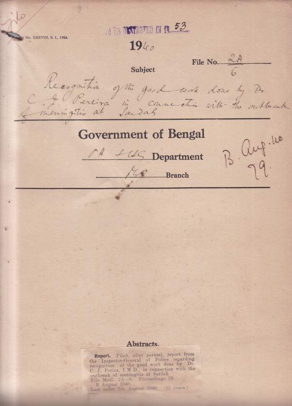 Recognition of the good work done by Dr. C.J. Perira in connection with the outbreak of meningitis at Sardah.