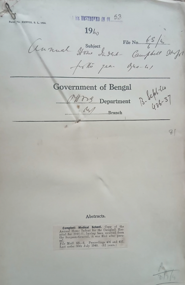 | Rack No. 8, Bundle No. 76, Sl No. 5878 Delegation of power to the Deputy Magistrate and Deputy Collector, Darjeeling u/s. 3(5) of the Indian Lunacy Act. | Rack No. 8, Bundle No. 76, Sl No. 5879 Election of Major Davidson, I.M.S., as a member of the Bengal Council of Medical Registration. | Rack No. 8, Bundle No. 76, Sl No. 5880 Provision of Sink in the Pantry on the ground floor in the Medical Officer's attached to the P.G.H. Calcutta. | Rack No. 8, Bundle No. 76, Sl No. 5881 Annual Home Indent Campbell Hospital for the year 1940-41. | Rack No. 8, Bundle No. 76, Sl No. 5882 Appointment of Dr. Harish Ch. Sen, as Civil Surgeon Faridpur. | Rack No. 8, Bundle No. 76, Sl No. 5883 Election of Dr. Ramgati Banerjee, as a member of the Bengal Council of Medical Registration. | Rack No. 8, Bundle No. 76, Sl No. 5884 Grant to the Arambagh Hospital for two Seats exclusively for Police Officers and men. |