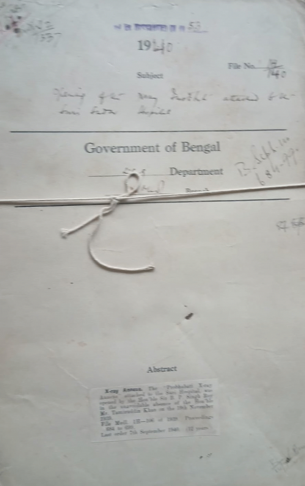 | Rack No. 8, Bundle No. 76, Sl No. 5884 Grant to the Arambagh Hospital for two Seats exclusively for Police Officers and men. | Rack No. 8, Bundle No. 76, Sl No. 5885 Election of Lt. Col. B.G. Mallya, I.M.S., on the Bengal Council of Medical Registration. | Rack No. 8, Bundle No. 76, Sl No. 5886 Surrender of S.A.S. to Military Duty. | Rack No. 8, Bundle No. 76, Sl No. 5887 Opening of the X-ray Institute attached to the Suri Sadar Hospital. | Rack No. 8, Bundle No. 76, Sl No. 5888 Express delivery through the Central Despatcch Office. | Rack No. 8, Bundle No. 76, Sl No. 5889 A.Q. by Mr. Birendra Kishore Rai Chowdhury regarding study leave of B.M.S. Officers. | Rack No. 8, Bundle No. 76, Sl No. 5890 A.Q. by Mr. Abdul Bari regarding Study leave of B.M.S. Officers. |