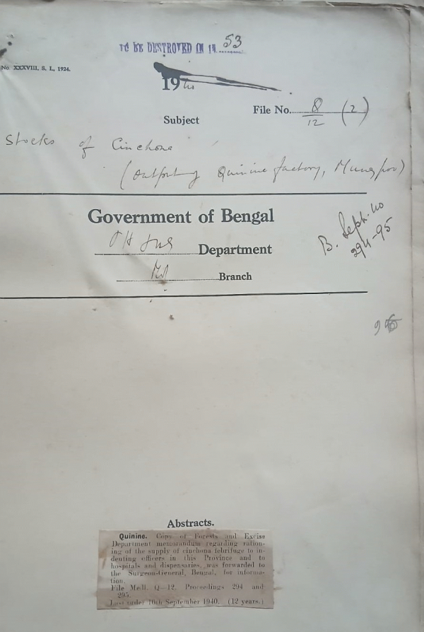 | Rack No. 8, Bundle No. 76, Sl No. 5889 A.Q. by Mr. Birendra Kishore Rai Chowdhury regarding study leave of B.M.S. Officers. | Rack No. 8, Bundle No. 76, Sl No. 5890 A.Q. by Mr. Abdul Bari regarding Study leave of B.M.S. Officers. | Rack No. 8, Bundle No. 76, Sl No. 5891 Remission of fees from Paying Patients of P.G.H. during 36-37 and 1937-38. | Rack No. 8, Bundle No. 76, Sl No. 5892 Stocks of Cinchona. | Rack No. 8, Bundle No. 76, Sl No. 5893 Bengal Passage Rules Amendment. | Rack No. 8, Bundle No. 76, Sl No. 5894 L.A. for a dispensary at Lakshmanhati in the District of Rajshahi. | Rack No. 8, Bundle No. 76, Sl No. 5895 Installation of a 2nd Frigidaire in the Bacteriological Department Medical College, Calcutta. |