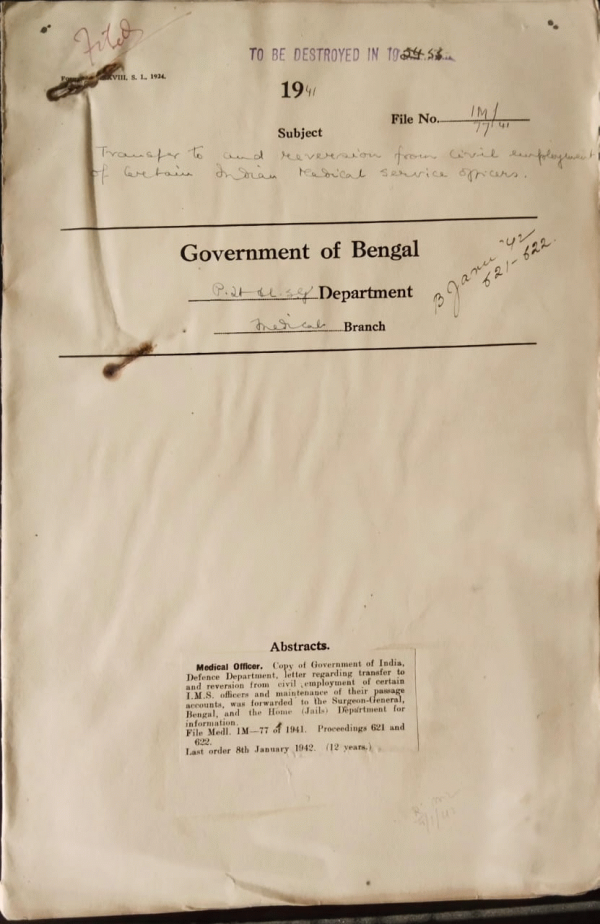 | Rack No. 9, Bundle No. 82, Sl No. 6334 Dismissed sub-assistant surgeons Prohibition for Re-employment in Sind Province. | Rack No. 9, Bundle No. 82, Sl No. 6335 Payment of T.A. to non-official members of the Board of Trustees, who permanently reside at Ranchi. | Rack No. 9, Bundle No. 82, Sl No. 6336 Removal of two guns from Civil Surgeons quarters. | Rack No. 9, Bundle No. 82, Sl No. 6337 Transfer to and reversion from Civil employment of certain Indian Medical Service Officers. | Rack No. 9, Bundle No. 82, Sl No. 6338 Grant of an allowance to the Sub-Assistant Surgeon Dr. Bhola Nath Roy for holding charge of the Civil Station Malda. | Rack No. 9, Bundle No. 82, Sl No. 6339 Suspension of normal arrangements in regard to leave and holidays in view of the emergency that has arisen owing to the war with Japan. | Rack No. 9, Bundle No. 82, Sl No. 6340 Confidential Rolls of Mr. N.N. Mitra, retired Assistant Accounts officers of A.G.B's Office. |