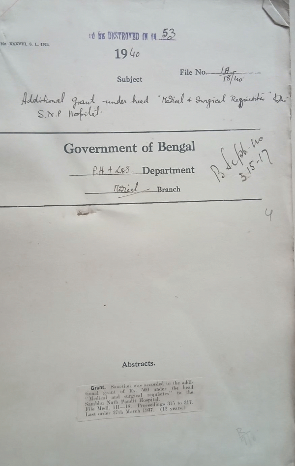 | Rack No. 8, Bundle No. 76, Sl No. 5901 Case of Cr. lunatic Chan Moni Baina alias Batiga Bania. | Rack No. 8, Bundle No. 76, Sl No. 5902 Application offering services for war Dr. Govinda Gopal Bose, M.B. | Rack No. 8, Bundle No. 76, Sl No. 5903 Case of Cr. lunatic Golak Nath Mukhrji. | Rack No. 8, Bundle No. 76, Sl No. 5904 Additional grant under head "Medical and Surgical Requisites" to the S.N.P. Hospital. | Rack No. 8, Bundle No. 76, Sl No. 5905 Acceptance of employment under the crown by officers of Indian Services, during leave preparatory to retirement. | Rack No. 8, Bundle No. 76, Sl No. 5906 Public Holidays Celebration of the King Emperor birth day. | Rack No. 8, Bundle No. 76, Sl No. 5907 Recall of Dr. D.J. Burnett, I.M.D. to the Military Duty. |