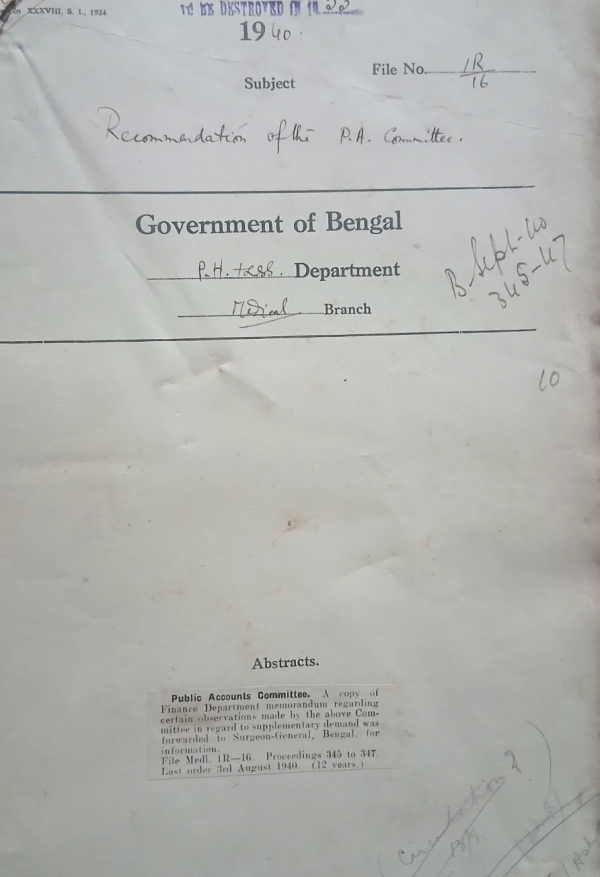 | Rack No. 8, Bundle No. 76, Sl No. 5907 Recall of Dr. D.J. Burnett, I.M.D. to the Military Duty. | Rack No. 8, Bundle No. 76, Sl No. 5908 Bonus on Postal life Insurance Policies. | Rack No. 8, Bundle No. 76, Sl No. 5909 A.Q. By Rai Harendra Nath Chowdhury regarding study leave of B.M.S. officers. | Rack No. 8, Bundle No. 76, Sl No. 5910 Recommendation of the Public Accounts Committee. | Rack No. 8, Bundle No. 76, Sl No. 5911 Increase in the rates of P. and O. fares. | Rack No. 8, Bundle No. 76, Sl No. 5912 Procurement of Supplies. | Rack No. 8, Bundle No. 76, Sl No. 5913 Appointment of Dr. Manindra Nath Mallick, as officiating Civil Surgeon Tippera. |
