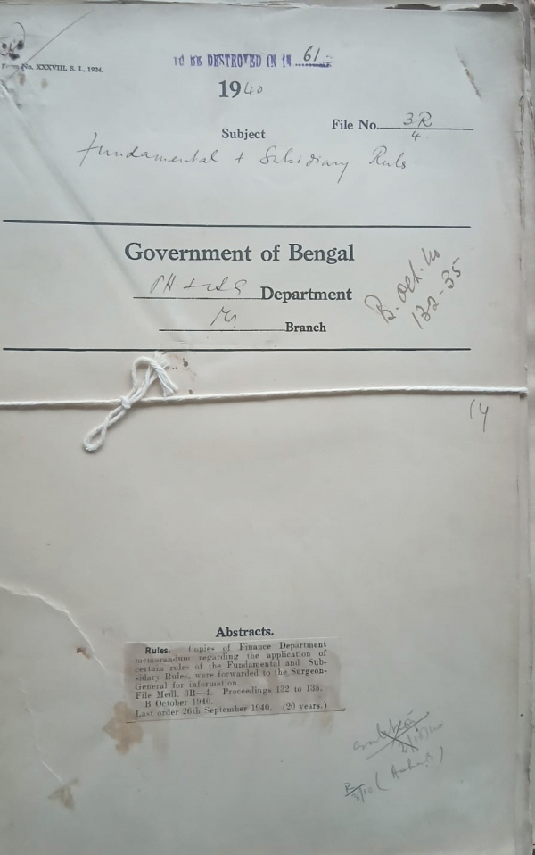 | Rack No. 8, Bundle No. 76, Sl No. 5911 Increase in the rates of P. and O. fares. | Rack No. 8, Bundle No. 76, Sl No. 5912 Procurement of Supplies. | Rack No. 8, Bundle No. 76, Sl No. 5913 Appointment of Dr. Manindra Nath Mallick, as officiating Civil Surgeon Tippera. | Rack No. 8, Bundle No. 76, Sl No. 5914 Fundamental and Subsidiary Rules. | Rack No. 8, Bundle No. 76, Sl No. 5915 List of associations recognized by the Govt. | Rack No. 8, Bundle No. 76, Sl No. 5916 Retention of Major General P.S. Mills. I.M.S. from leave. | Rack No. 8, Bundle No. 76, Sl No. 5917 A.Q. by Rai Sahib Kirit Bhusan Das regarding total expenditure by Govt. for maintaining the school of Tropical Medicine, Calcutta. |