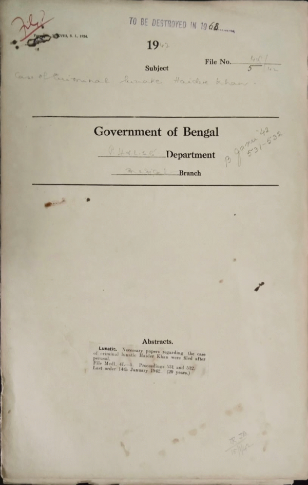 | Rack No. 9, Bundle No. 82, Sl No. 6350 Incidence of Pensioner and leave charges in respect of the period of naval training of Royal Indian Fleet or Indian Army reservists in Civil employ. | Rack No. 9, Bundle No. 82, Sl No. 6351 Maintenance of the Charitable dispensary at Betai by the District Board, Nadia. | Rack No. 9, Bundle No. 82, Sl No. 6352 Rules regarding recruitments of B.M.S. officers. | Rack No. 9, Bundle No. 82, Sl No. 6353 Case of Cr. lunatic Haider Khan. | Rack No. 9, Bundle No. 82, Sl No. 6354 Case of Criminal lunatic. | Rack No. 9, Bundle No. 82, Sl No. 6355 Radha Gobinda Das. | Rack No. 9, Bundle No. 82, Sl No. 6356 "Information Pamphlet" giving particulars of Emergency Commissions in His Majesty's Indian Land Forces. |