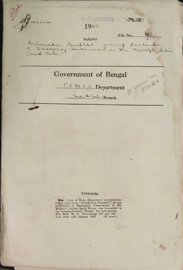 | Rack No. 9, Bundle No. 82, Sl No. 6352 Rules regarding recruitments of B.M.S. officers. | Rack No. 9, Bundle No. 82, Sl No. 6353 Case of Cr. lunatic Haider Khan. | Rack No. 9, Bundle No. 82, Sl No. 6354 Case of Criminal lunatic. | Rack No. 9, Bundle No. 82, Sl No. 6355 Radha Gobinda Das. | Rack No. 9, Bundle No. 82, Sl No. 6356 "Information Pamphlet" giving particulars of Emergency Commissions in His Majesty's Indian Land Forces. | Rack No. 9, Bundle No. 82, Sl No. 6357 Improvement of the Children's ward in the Medical College Hospitals, Calcutta. | Rack No. 9, Bundle No. 82, Sl No. 6358 Provision of teak wood Shelves in the office room of the Civil Surgeons residence at Dacca. |