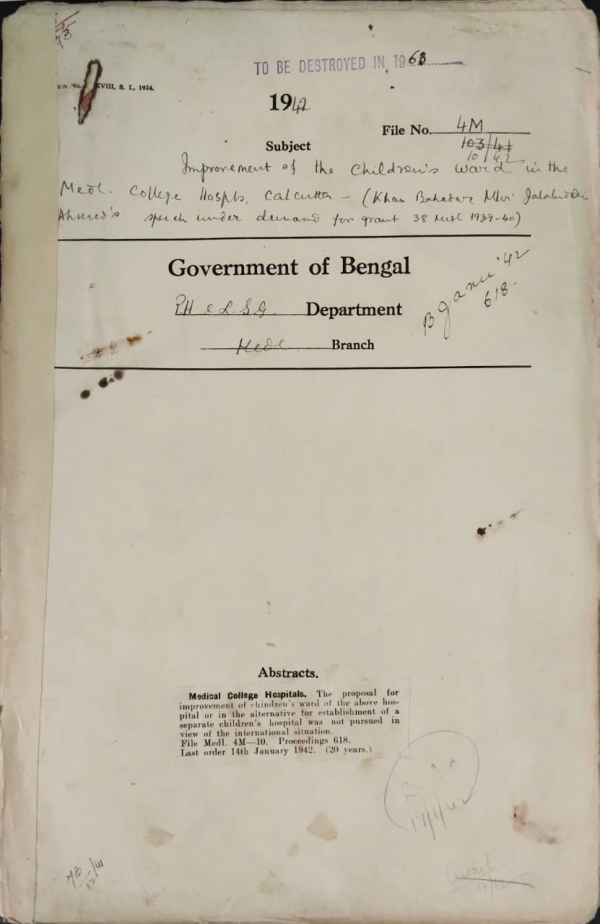 | Rack No. 9, Bundle No. 82, Sl No. 6354 Case of Criminal lunatic. | Rack No. 9, Bundle No. 82, Sl No. 6355 Radha Gobinda Das. | Rack No. 9, Bundle No. 82, Sl No. 6356 "Information Pamphlet" giving particulars of Emergency Commissions in His Majesty's Indian Land Forces. | Rack No. 9, Bundle No. 82, Sl No. 6357 Improvement of the Children's ward in the Medical College Hospitals, Calcutta. | Rack No. 9, Bundle No. 82, Sl No. 6358 Provision of teak wood Shelves in the office room of the Civil Surgeons residence at Dacca. | Rack No. 9, Bundle No. 82, Sl No. 6359 Eligibility of Americans for admission to the Ranchi European Mental Hospital. | Rack No. 9, Bundle No. 82, Sl No. 6360 Advance to Govt. Servants for sending their families out of Chittagong (town). |