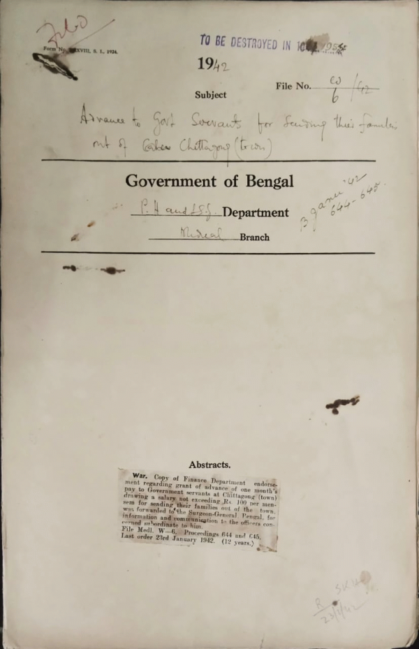 | Rack No. 9, Bundle No. 82, Sl No. 6357 Improvement of the Children's ward in the Medical College Hospitals, Calcutta. | Rack No. 9, Bundle No. 82, Sl No. 6358 Provision of teak wood Shelves in the office room of the Civil Surgeons residence at Dacca. | Rack No. 9, Bundle No. 82, Sl No. 6359 Eligibility of Americans for admission to the Ranchi European Mental Hospital. | Rack No. 9, Bundle No. 82, Sl No. 6360 Advance to Govt. Servants for sending their families out of Chittagong (town). | Rack No. 9, Bundle No. 82, Sl No. 6361 Telephone Bill for 28 Darjeeling. | Rack No. 9, Bundle No. 82, Sl No. 6362 Posting of Dr. W.H. Collins I.M.D. on supernumerary duty at the P.G.H. Calcutta. | Rack No. 9, Bundle No. 82, Sl No. 6363 School of Tropical Medicine Payment of arrear Charges. |