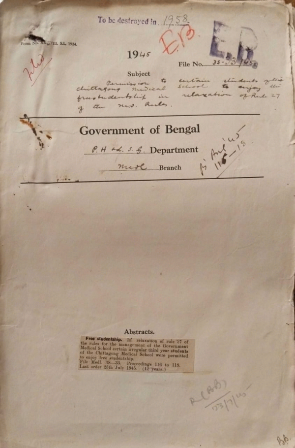 Permission to certain students of the Chittagong Medical School to enjoy the free Studentship in relaxation of Rule 27.