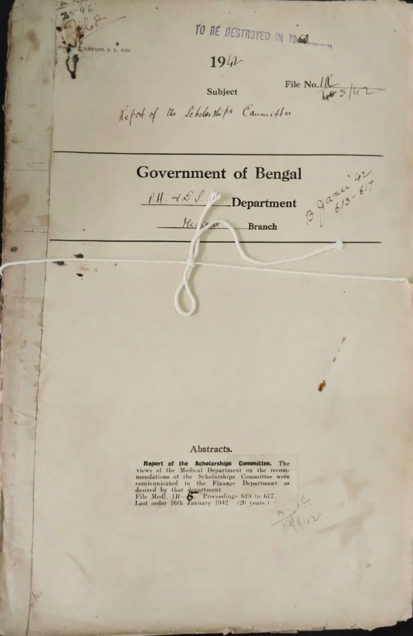 | Rack No. 9, Bundle No. 82, Sl No. 6362 Posting of Dr. W.H. Collins I.M.D. on supernumerary duty at the P.G.H. Calcutta. | Rack No. 9, Bundle No. 82, Sl No. 6363 School of Tropical Medicine Payment of arrear Charges. | Rack No. 9, Bundle No. 82, Sl No. 6364 C.Q. Mr. Humayun Kabir regarding the death of a female Patient in the Faridpur Sadar Hospital. | Rack No. 9, Bundle No. 82, Sl No. 6365 Report of the Scholarships Committee. | Rack No. 9, Bundle No. 82, Sl No. 6366 Cost of Printing of the question papers of the Faculty at the Bengal Govt. Press Alipore. | Rack No. 9, Bundle No. 82, Sl No. 6367 Study leave of Certain B.M.S. Officers. | Rack No. 9, Bundle No. 82, Sl No. 6368 Essential Drugs (Census) Orders, 1941. |