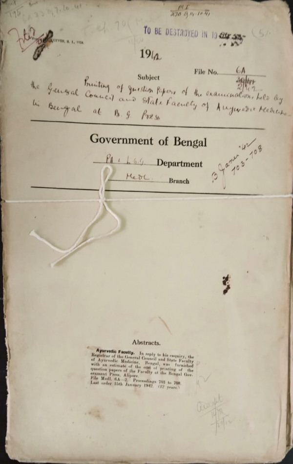 | Rack No. 9, Bundle No. 82, Sl No. 6363 School of Tropical Medicine Payment of arrear Charges. | Rack No. 9, Bundle No. 82, Sl No. 6364 C.Q. Mr. Humayun Kabir regarding the death of a female Patient in the Faridpur Sadar Hospital. | Rack No. 9, Bundle No. 82, Sl No. 6365 Report of the Scholarships Committee. | Rack No. 9, Bundle No. 82, Sl No. 6366 Cost of Printing of the question papers of the Faculty at the Bengal Govt. Press Alipore. | Rack No. 9, Bundle No. 82, Sl No. 6367 Study leave of Certain B.M.S. Officers. | Rack No. 9, Bundle No. 82, Sl No. 6368 Essential Drugs (Census) Orders, 1941. | Rack No. 9, Bundle No. 82, Sl No. 6369 Proposal for the opening of a chronic depot for incurable patients, at the Ranchi Indian Mental Hospital. |