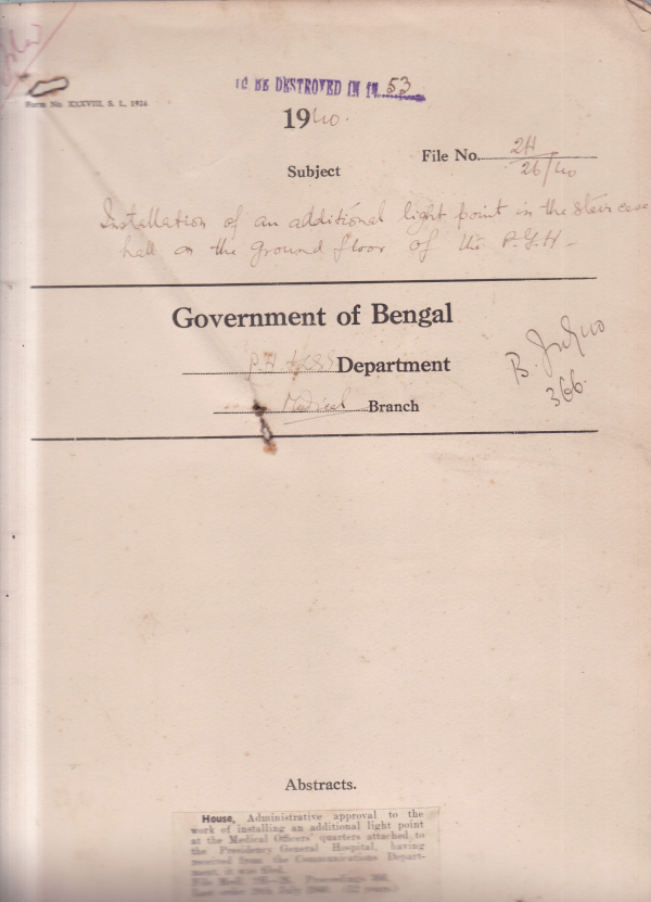 | Rack no. 08, Bundle no. 72, Sl no. 5535 Orders regulating the maximum grant of passage benefits and supplementary regulations governing the procedure relating to the grant of these benefits issued by the Governor General. | Rack no. 08, Bundle no. 72, Sl no. 5536 Registration of British Subjects. | Rack no. 08, Bundle no. 72, Sl no. 5537 Additional grant under the head "Presidency Hospital and Dispensaries pay of officers changed." | Rack no. 08, Bundle no. 72, Sl no. 5538 Installation of an additional light point in the stair case hall on the ground floor of the P.G.H. | Rack no. 08, Bundle no. 72, Sl no. 5539 Installation of electric lights and fans in the C.S.'S. Residence of Berhampore. | Rack no. 08, Bundle no. 72, Sl no. 5540 Electric current consumed in the electric mechanic's quarters at P.G.H. | Rack no. 08, Bundle no. 72, Sl no. 5541 Training of Sub-Assistant Surgeons from three Control Jails in the Dental Department, Medical College, and Calcutta. |