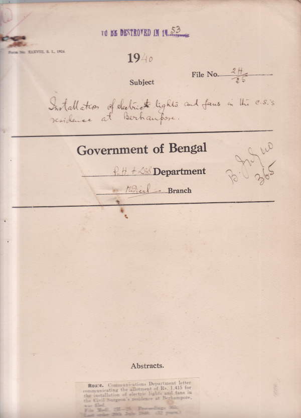 Installation of electric lights and fans in the C.S.'S. Residence of Berhampore.