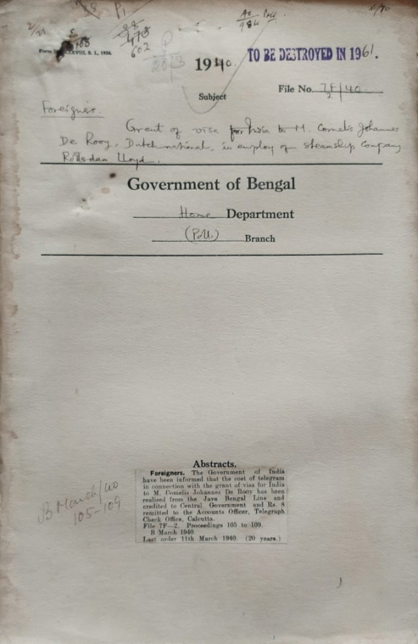 Grant of Visa for India to Mr. Cornelis Johannes de Roy, Dutch National of Steamship Co.