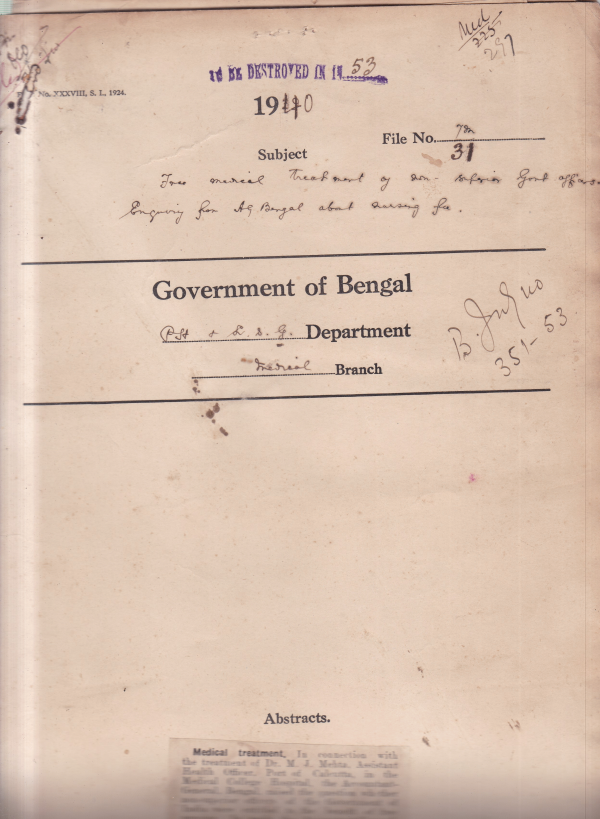 | Rack no. 08, Bundle no. 72, Sl no. 5544 Civil Surgeon's residence at Malda work for the providing water Pipe Connections and Sanitary fittings. | Rack no. 08, Bundle no. 72, Sl no. 5545 Provision of Sanitary fittings and underground drainage in the Medical Officer's quarters of the P.G.H. | Rack no. 08, Bundle no. 72, Sl no. 5546 Actions taken by Govt. on the Council resolutions. | Rack no. 08, Bundle no. 72, Sl no. 5547 Free medical treatment of non-superior govt. officer's enquiry from A.G. Bengal about the benefit of free nursing. | Rack no. 08, Bundle no. 72, Sl no. 5548 Submission of applications from European dentists who volunteer their services in the war. | Rack no. 08, Bundle no. 72, Sl no. 5549 Appointment of Dr. Sudhir Kumar Bose as Medical Officer of Maternity and Child welfare centre at the Ram Krishna Asram, Jalpaiguri. | Rack no. 08, Bundle no. 72, Sl no. 5550 Election of fellows of the State Medical Faculty of Bengal. |