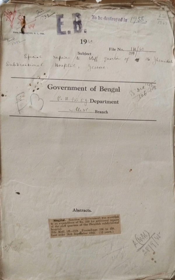Special repairs to staff quarter of the Jhenidah Sub divisional Hospital, Jessore.