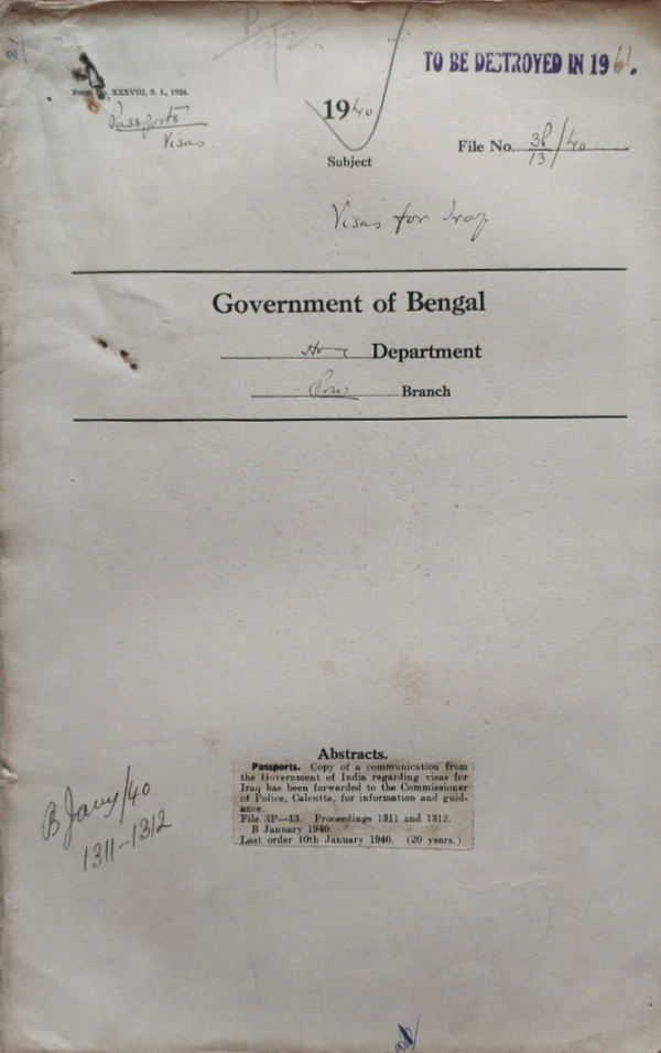 | Rack No. 42, Bundle No. 04, Sl No. 236 Warrant of Precedence meaning of them Class-I Provincial Service. | Rack No. 42, Bundle No. 04, Sl No. 237 Change of Service names of govt. servants. | Rack No. 42, Bundle No. 04, Sl No. 238 Grant and renewal of German Passports. | Rack No. 42, Bundle No. 04, Sl No. 239 Visas for Iraq. | Rack No. 42, Bundle No. 04, Sl No. 240 Instruction regarding methods of obtaining information's aliens when granting them Visas and Permits etc. | Rack No. 42, Bundle No. 04, Sl No. 241 "Allowances to facilities of make internees interned as a result of war. " | Rack No. 42, Bundle No. 04, Sl No. 242 Refusal of a Passport to Mr. Nandadulal Mukherjee. |