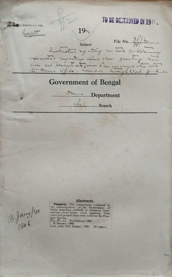 | Rack No. 42, Bundle No. 04, Sl No. 237 Change of Service names of govt. servants. | Rack No. 42, Bundle No. 04, Sl No. 238 Grant and renewal of German Passports. | Rack No. 42, Bundle No. 04, Sl No. 239 Visas for Iraq. | Rack No. 42, Bundle No. 04, Sl No. 240 Instruction regarding methods of obtaining information's aliens when granting them Visas and Permits etc. | Rack No. 42, Bundle No. 04, Sl No. 241 "Allowances to facilities of make internees interned as a result of war. " | Rack No. 42, Bundle No. 04, Sl No. 242 Refusal of a Passport to Mr. Nandadulal Mukherjee. | Rack No. 42, Bundle No. 04, Sl No. 243 Grant of facilities to the uncle Dalailama to go China Via India. |