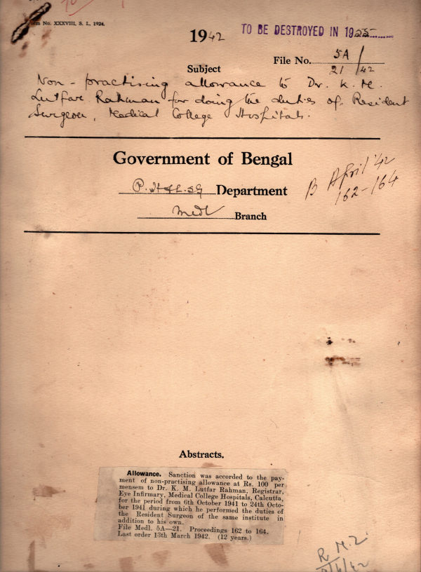 | Rack No. 09; Bundle No. 86 SL No. 6628 Grant to the Thana dispensary at Mantes war in the district of Burdwan. | Rack No. 09; Bundle No. 86 SL No. 6629 Additional grant to Campbell Medical Sehar and hospital under head other contingent charges. | Rack No. 09; Bundle No. 86 SL No. 6630 Appointment of temporary Registrars Medical College Hospital, Calcutta. | Rack No. 09; Bundle No. 86 SL No. 6631 Non practicing allowance to Dr. K.M. Lutfar Rahman doing the duties of Resident Surgeon medical College Hospital. | Rack No. 09; Bundle No. 86 SL No. 6632 Reporters employed in the Bengal Legislative Assembly and Bengal Legislative council Department effective control of the | Rack No. 09; Bundle No. 86 SL No. 6633 Preservation of an extra seat in the medical college, Calcutta for students from the excluded areas of Assam. | Rack No. 09; Bundle No. 86 SL No. 6634 Rules for the maintenance and occupation of Circuit house in Bengal. |