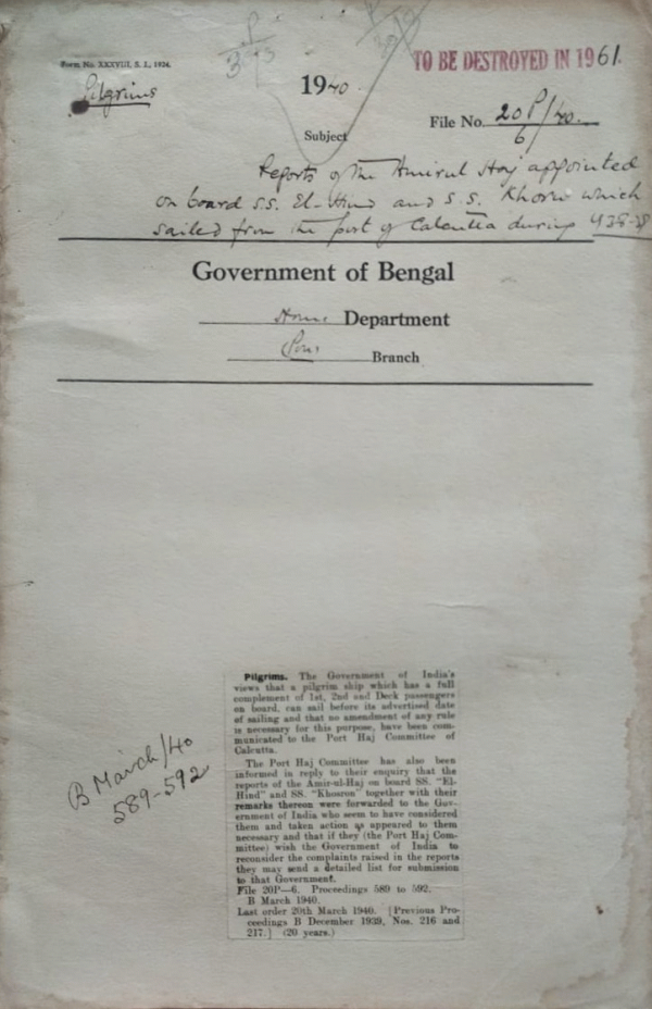 Reports of the Anair-Ul-Haj appointed on board SS. Khora wich Sailed from the port of Calcutta during 1938-39.