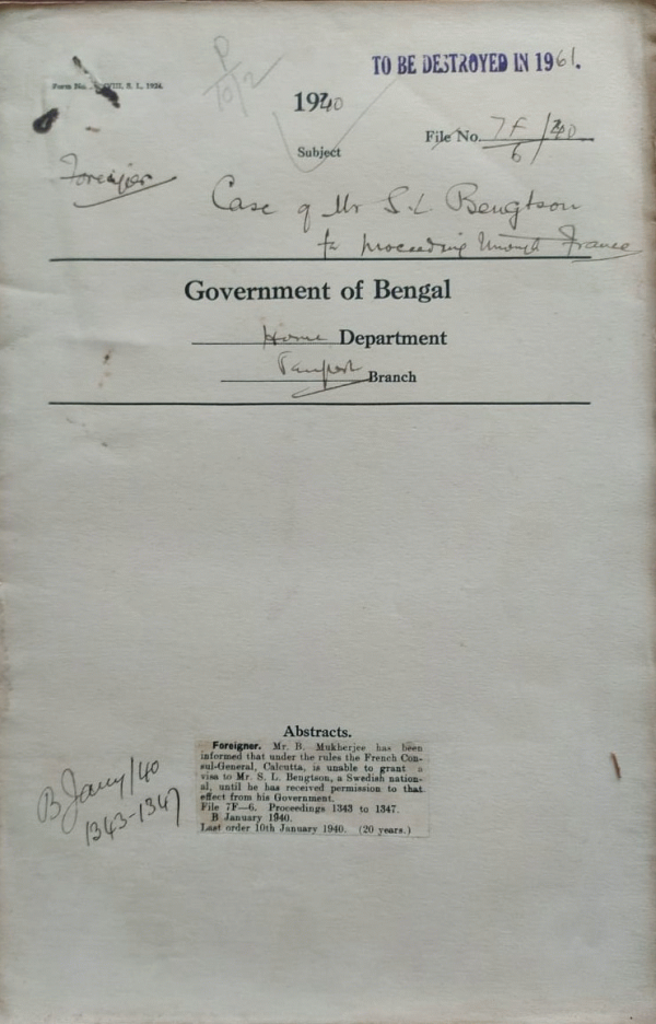 Grant a visa to Mr. S.L. Bengtson , a swedish national until he has received permission, under the rules the French Consul-General, Calcutta.