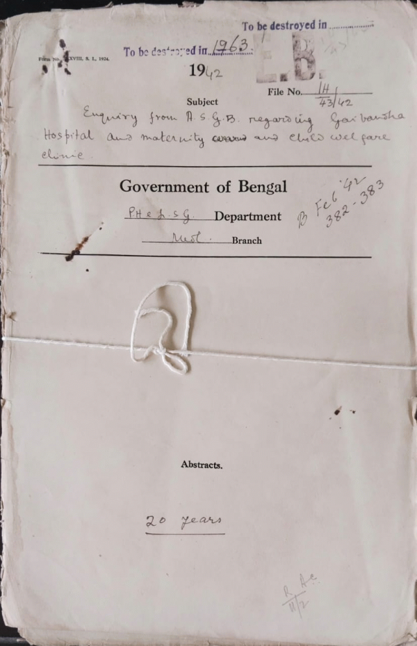 | Rack No. 9, Bundle No. 83, Sl No. 6395 Grant of an advance from the General Provident Fund to Babu Surath Kumar Mazumder. | Rack No. 9, Bundle No. 83, Sl No. 6396 Creation of Provident Funds for the employees of the Endowment Fund of the School of Tropical Medical, Calcutta. | Rack No. 9, Bundle No. 83, Sl No. 6397 L.A. for Chittaranjan Seva Sadan. | Rack No. 9, Bundle No. 83, Sl No. 6398 Enquiry from A.S.G.B. regarding Gaibandha Hospital and Maternity and Child Welfare Clinic. | Rack No. 9, Bundle No. 83, Sl No. 6399 Increase of the annual grant of the Khanjanpur Charitable dispensary in the Bogra District. | Rack No. 9, Bundle No. 83, Sl No. 6400 Civil Service Regulations. | Rack No. 9, Bundle No. 83, Sl No. 6401 War Injuries ordinances scheme and Regulations 1941. |