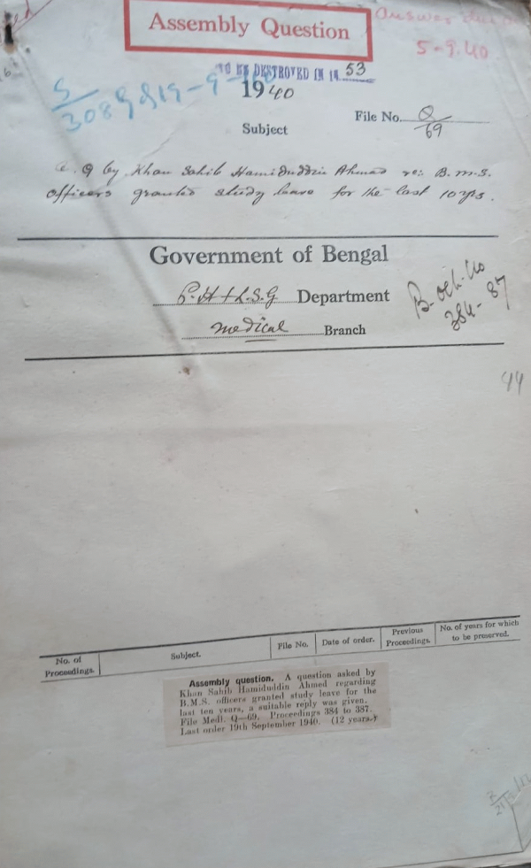 | Rack No. 8, Bundle No. 77, Sl No. 5941 Land Acquisition for Jadabpur Tuberculosis Hospital. | Rack No. 8, Bundle No. 77, Sl No. 5942 A.Q. by Khan Sahib Hamuddin Ahmed regarding proportion of Muslim & Scheduled castes among the examiners of the State Medical Faculty, Bengal. | Rack No. 8, Bundle No. 77, Sl No. 5943 A.Q. by Maulvi Waliur Rahman regarding names of B.M.S. officers recruited since 1926, which have never been posted to any mafassil station. | Rack No. 8, Bundle No. 77, Sl No. 5944 A.Q. by Khan Sahib Hamiduddin Ahmed regarding B.M.S. officers grated study leave for the last 10 years. | Rack No. 8, Bundle No. 77, Sl No. 5945 Extension of tenure of appointment of Dr. A.K. Bose Honorary Junior Physician, MCH. | Rack No. 8, Bundle No. 77, Sl No. 5946 Appointment of Capital J. White to meet as Superintendent Midnapur Central Jail. | Rack No. 8, Bundle No. 77, Sl No. 5947 Appointment of the Honorary teacher of ophthalmic Surgery Campbell Medical School & Hospital. |