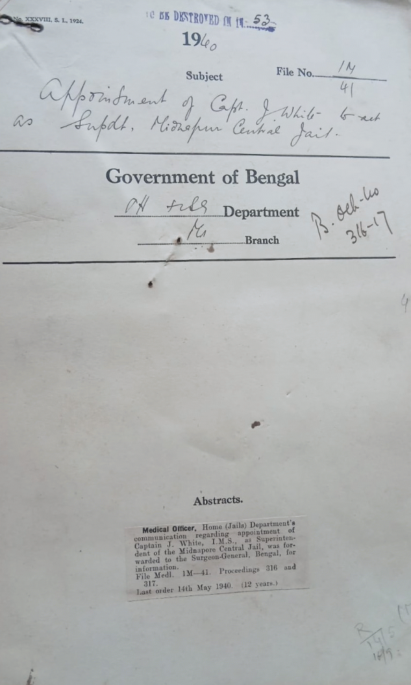 Appointment of Capital J. White to meet as Superintendent Midnapur Central Jail.