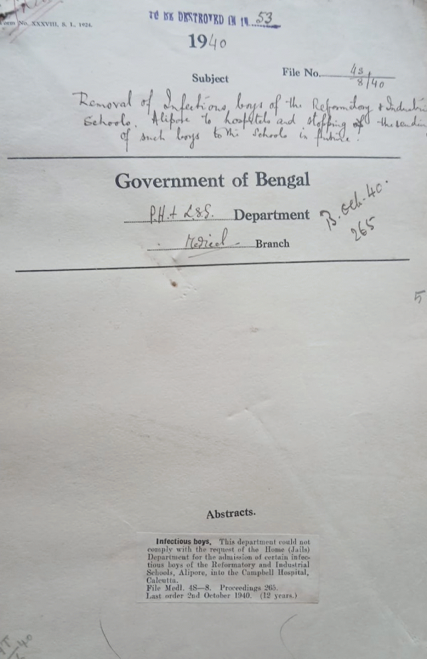 Removal of infections boys of the Reformatory & Industrial School, Alipore to hospitals & Stopping the sending of such boys to the school in future.