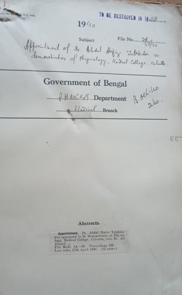 Appointment of Dr. Abdul Hafez Talukdar as Demonstrator of Physiology Medical College, Calcutta.