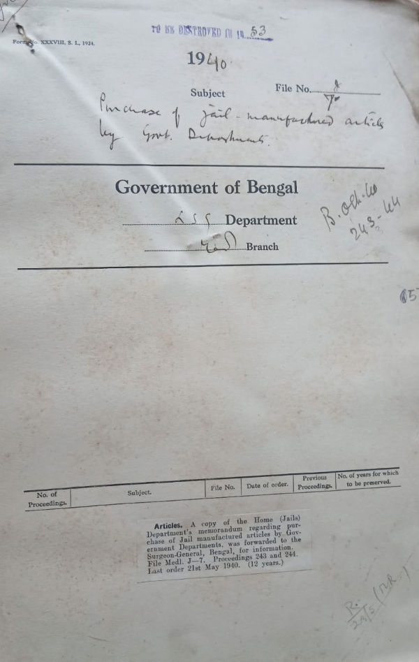 | Rack No. 8, Bundle No. 77, Sl No. 5954 Annual contribution to Jalpaiguri district Board by the Communications & works Department for the Medical treatment of their employees. | Rack No. 8, Bundle No. 77, Sl No. 5955 Appointment of Dr. Abdul Hafez Talukdar as Demonstrator of Physiology Medical College, Calcutta. | Rack No. 8, Bundle No. 77, Sl No. 5956 Appointment of Dr. Sanchidranath Roy as Medical officer, Tangail. | Rack No. 8, Bundle No. 77, Sl No. 5957 Purchase of Jail manufactured articles by Govt. Departments. | Rack No. 8, Bundle No. 77, Sl No. 5958 Relaxation of rules of the State Medical Faculty Regulation case of Kalipada Biswas of the National Medical Institute. | Rack No. 8, Bundle No. 77, Sl No. 5959 Draft rules for recruitment of the Bengal General Service. | Rack No. 8, Bundle No. 77, Sl No. 5960 Permission to Babu Heramba Sekhar Ghosal to work as Compounder in Bengal outside Calcutta. |