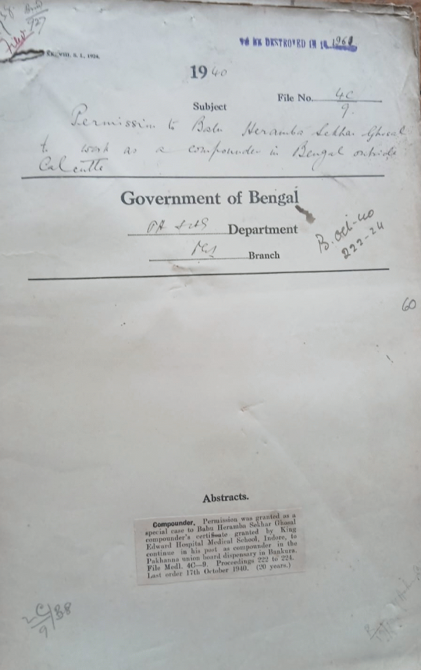 Permission to Babu Heramba Sekhar Ghosal to work as Compounder in Bengal outside Calcutta.