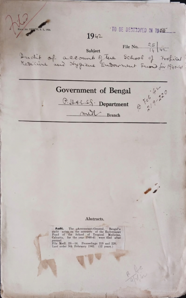 | Rack No. 9, Bundle No. 83, Sl No. 6415 Defense of India Rules Amendment. | Rack No. 9, Bundle No. 83, Sl No. 6416 Purchase of Stores for the Medical College Hospitals Dentan X-ray apparatus. | Rack No. 9, Bundle No. 83, Sl No. 6417 School of Tropical Medicine Appointment of Dr. P.A. Maple stone, research workers under Endowment fund of the School of Tropical Medicine as honorary Prof. of Helminthological. | Rack No. 9, Bundle No. 83, Sl No. 6418 Audit of Accounts of the School of Tropical Medicine and Hygiene Endowment Fund for 1940-41. | Rack No. 9, Bundle No. 83, Sl No. 6419 Death of non-criminal lunatic Abdul Rahman. | Rack No. 9, Bundle No. 83, Sl No. 6420 Extension of tenure of Dr. R.N. Ghose as Honorary Junior Surgeon, M.C.H. Calcutta. | Rack No. 9, Bundle No. 83, Sl No. 6421 Allowance to Dr. Nani Gopal Maitra, Sub-Assistant Surgeon, and Police Hospital Comilla for doing the Duties of the S.A.S in addition to his own. |
