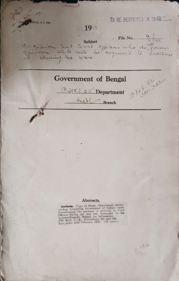 | Rack No. 9, Bundle No. 83, Sl No. 6421 Allowance to Dr. Nani Gopal Maitra, Sub-Assistant Surgeon, and Police Hospital Comilla for doing the Duties of the S.A.S in addition to his own. | Rack No. 9, Bundle No. 83, Sl No. 6422 Ex-Civil S.A.S. Recruitment to the Emergency Brach of the Indian Medical Department. | Rack No. 9, Bundle No. 83, Sl No. 6423 Posting of Dr. Hemanta Kumar Indra to the Sadar Hospital, Berhampore Vice Dr. Md. Abdul Khaleque and others arrangements. | Rack No. 9, Bundle No. 83, Sl No. 6424 Decision that Civil officers who do not possess uniform will not be required to purchase it during the war. | Rack No. 9, Bundle No. 83, Sl No. 6425 Payment of the arrear T.A. to Mr. Syed Badruduja for attending the selection committee, Campbell Medical School, Calcutta. | Rack No. 9, Bundle No. 83, Sl No. 6426 Public Service Commission Regulations amendments. | Rack No. 9, Bundle No. 83, Sl No. 6427 Fundamental and Subsidiary Rules amendments. |